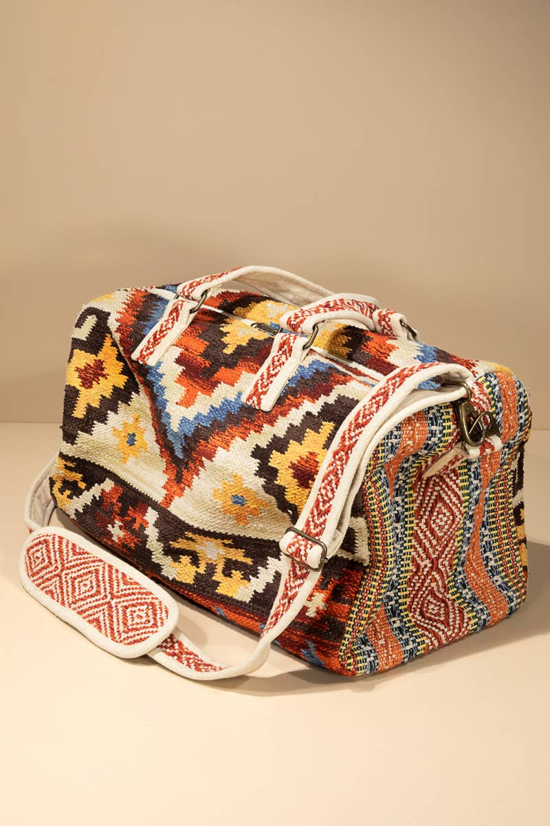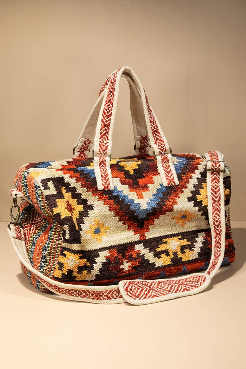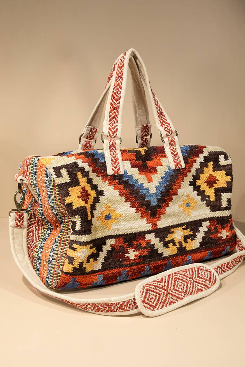 Handmade ethnic Navajo inspired pattern with short straps and adjustable shoulder straps featuring two slip pockets and zipper pocket inside fully fine cotton duffel bag.