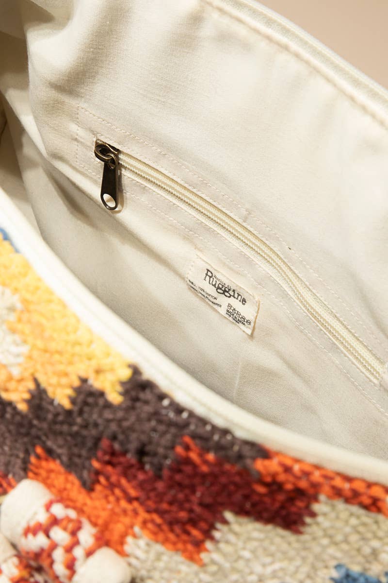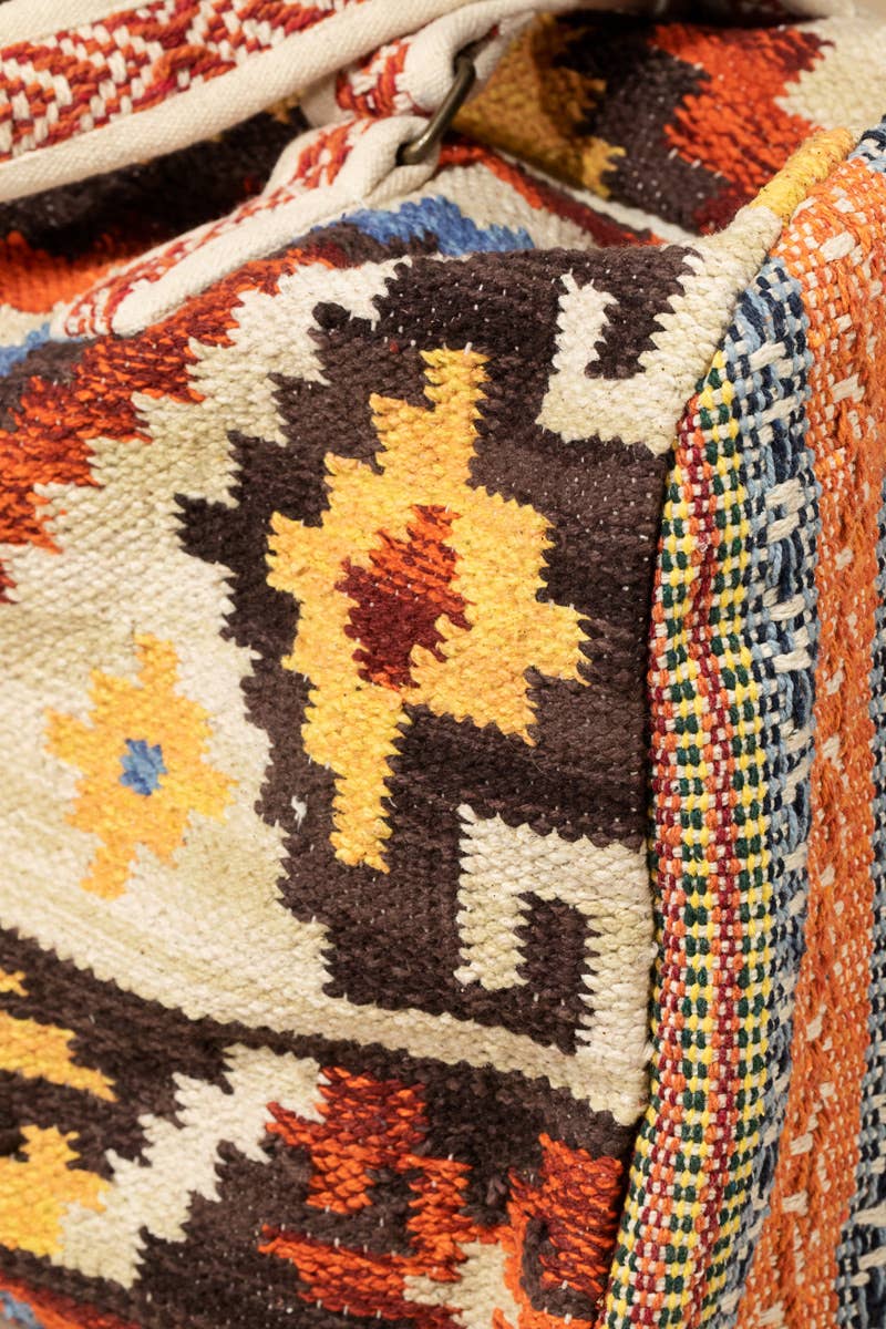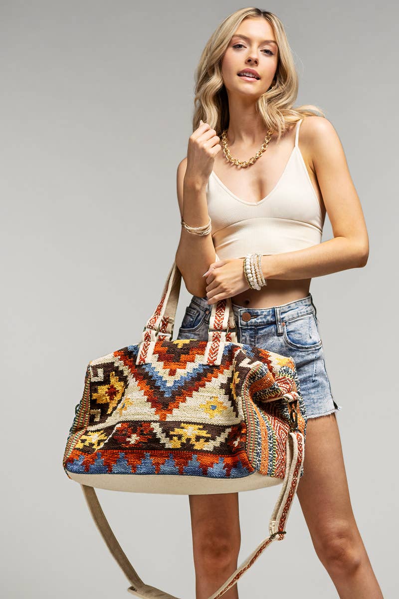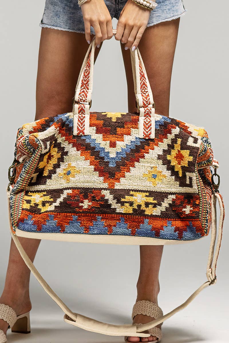 Handmade ethnic Navajo inspired pattern with short straps and adjustable shoulder straps featuring two slip pockets and zipper pocket inside fully fine cotton duffel bag.