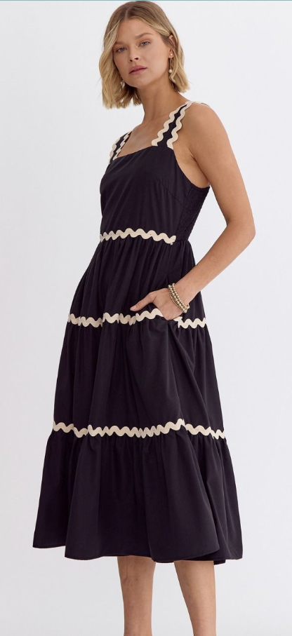 This sophisticated square neck sleeveless midi dress combines timeless elegance with practical design. The distinctive rick rack trimming in classic black and white creates visual interest along the silhouette. Featuring convenient side pockets and full lining, this lightweight woven piece offers both comfort and opacity. The non-sheer construction ensures confidence while the breathable fabric makes it ideal for various occasions and seasons.