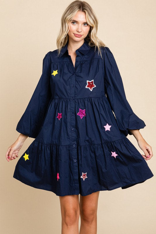 Star textured dress with collared neck, long peasant sleeves and shirring tiered layer.