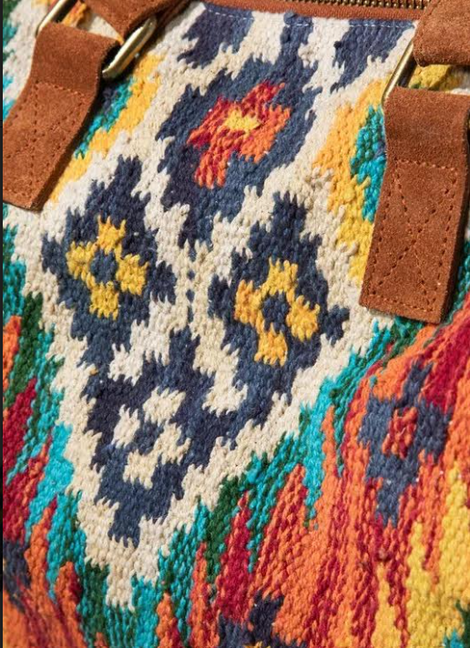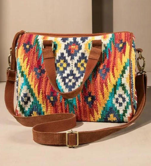 *Ruggine* This is a cotton & chenille space dye hand-woven Boston Bag in ethnic motif. It is made by weaving cotton and chenille yarns, creating a beautiful blend of colors. The bag features intricate ethnic patterns and designed to be both fashionable and functional, with detachable strap and practical interior pocket. This bag adds a unique and eye-catching touch to any outfit.