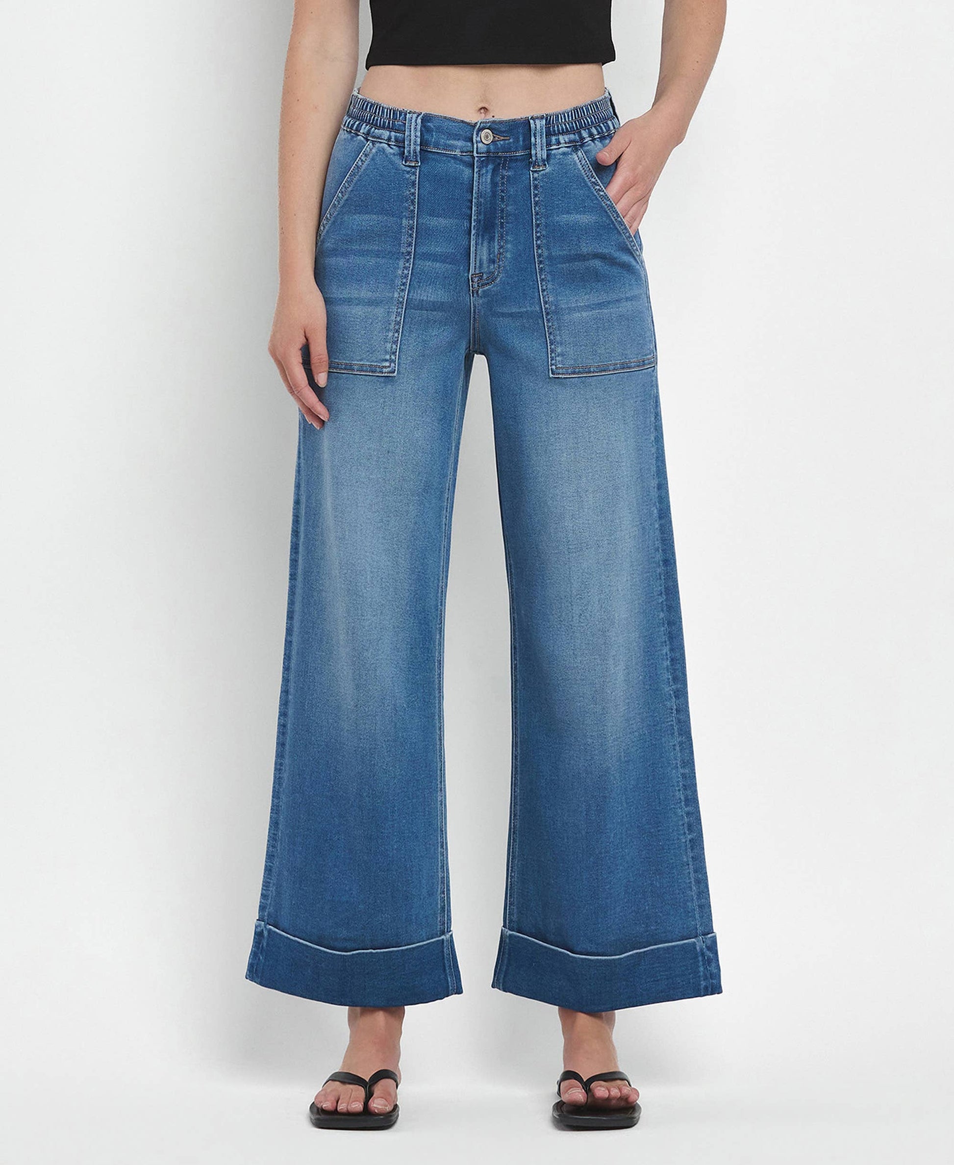 HIGH RISE DOUBLE CUFFED BAGGY WIDE JEANS COMFORT STRETCH DENIM, HIGH RISE WAIST, DOUBLE CUFF HEM, CROPPED LENGTH, BAGGY WIDE JEANS F. RISE: 10 1/2" / INSEAM: 27" / LEG OPENING: 21 1/2" / CUFF: 2 1/2" X 2 MODEL IS 5'10" WEARING A SIZE 26
