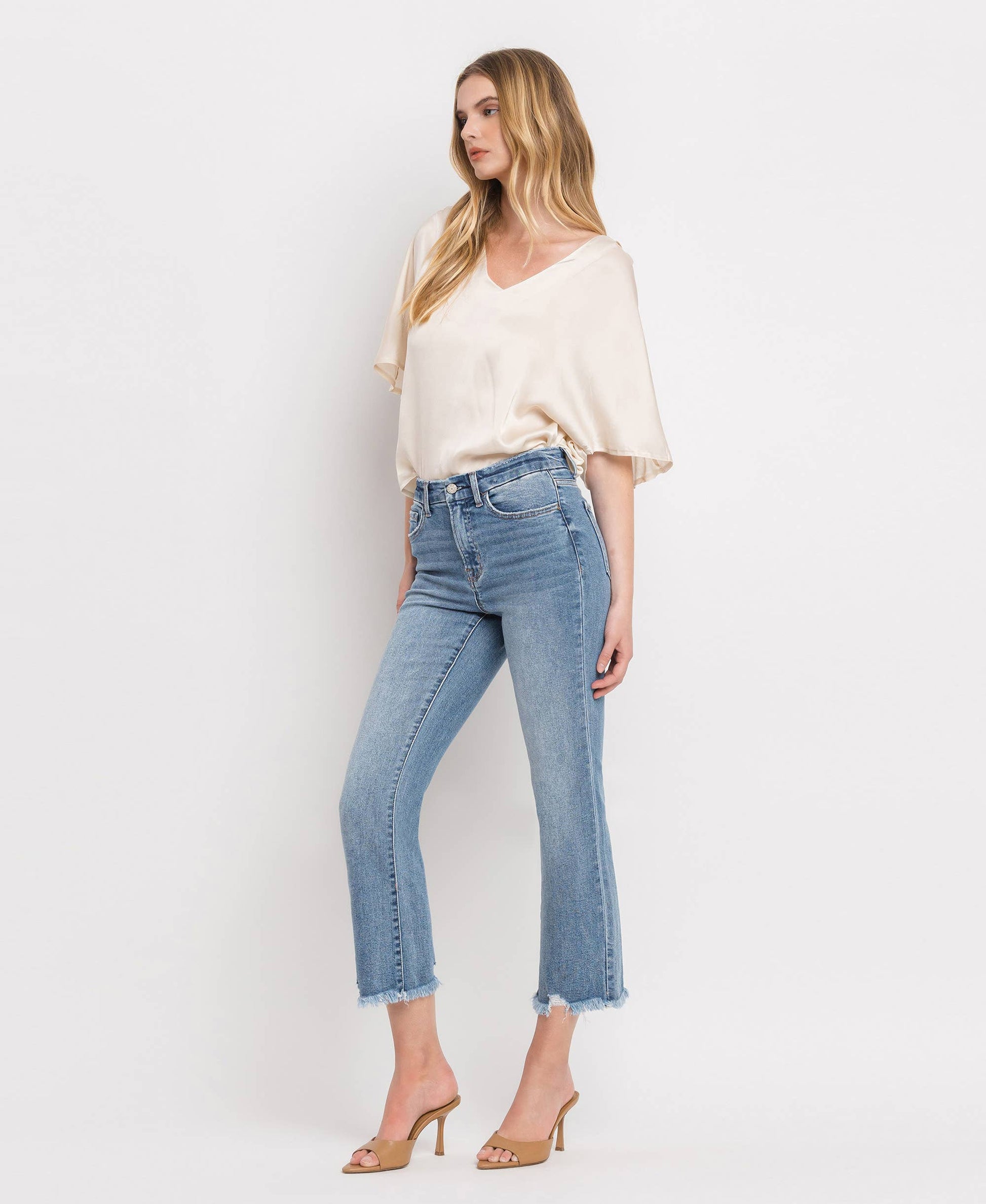 HIGH RISE FRAYED HEM CROP FLARE JEANS COMFORT STRETCH DENIM, HIGH RISE WAIST, FRAYED HEM, CROPPED LENGTH, FLARE JEANS F. RISE: 10" / INSEAM: 26 1/2" / LEG OPENING: 16 1/4"