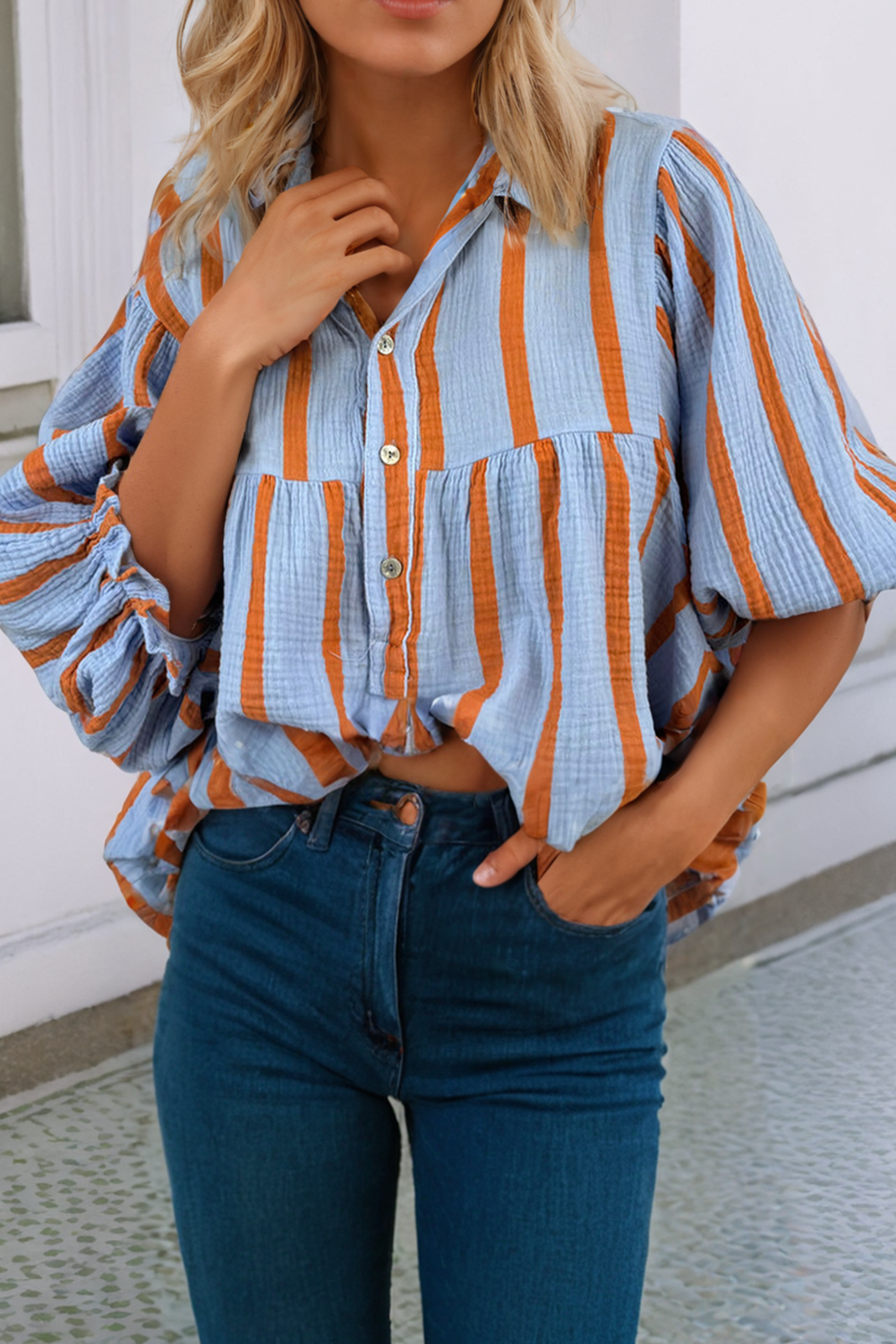 πŸ‘š Elevate your everyday style with this loose shirt, offering both fashion and comfort. πŸ”³ Vertical stripes work their magic, creating a slimming effect on this laid-back piece. πŸŒ€ The crinkled texture adds a relaxed and casual vibe to this versatile shirt.