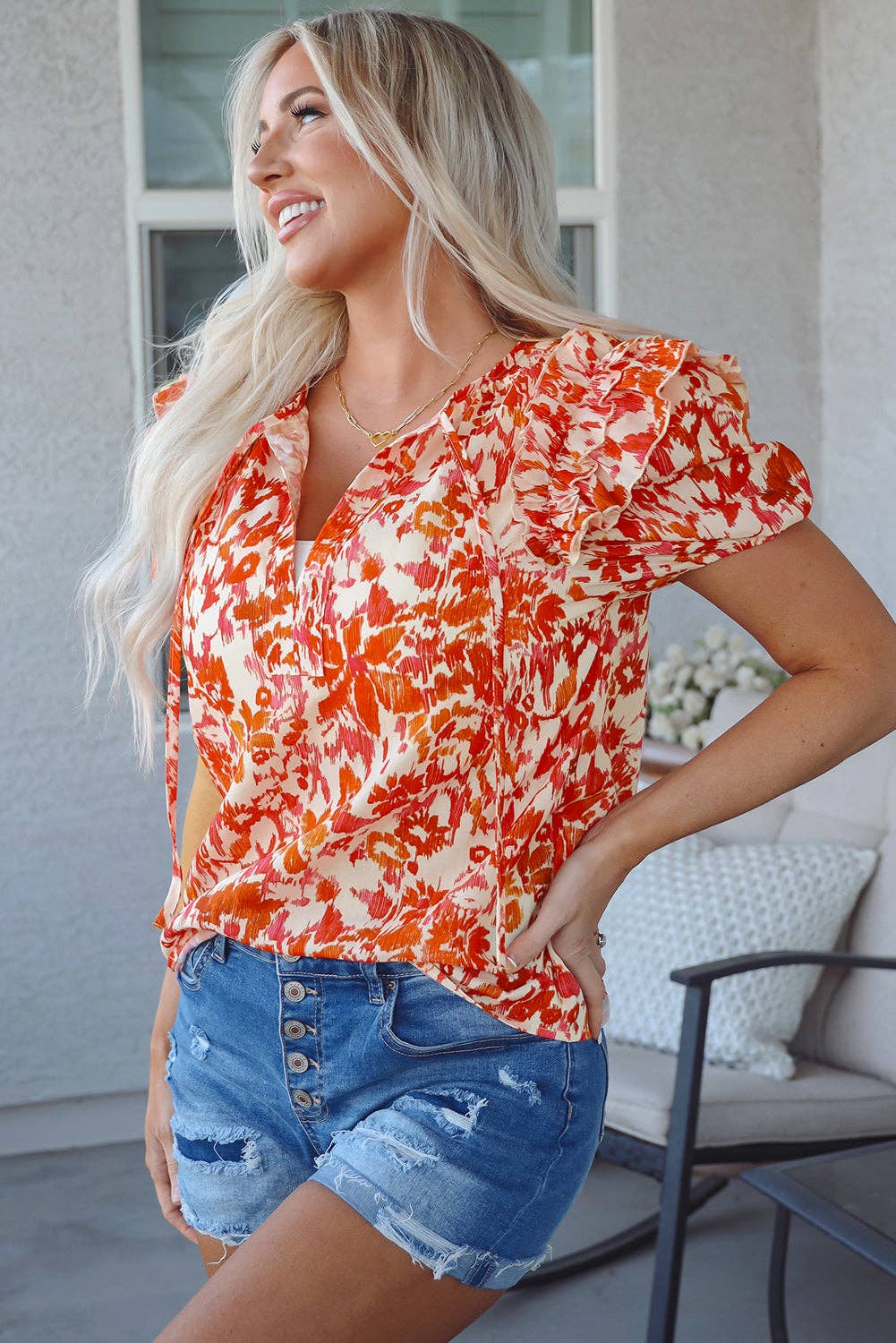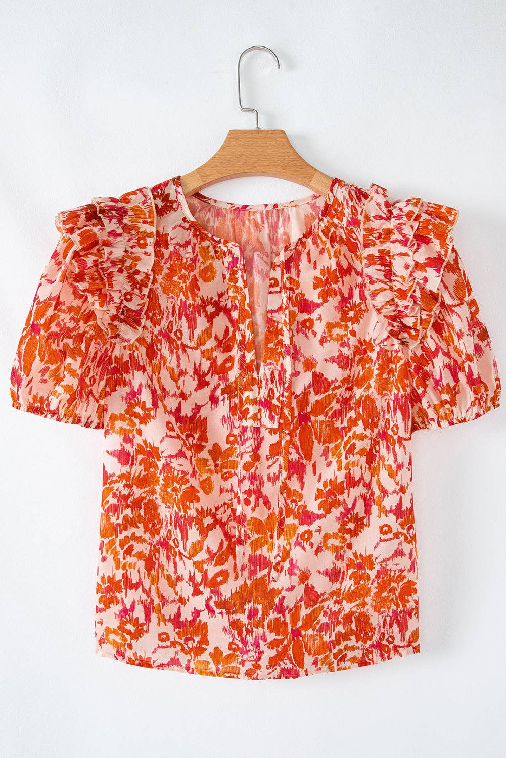 Elevate your style with this puff sleeve blouse, featuring a playful ruffle detail. Embrace nature's beauty with the vibrant floral print and make a statement in the trendy split neck design. Enjoy the relaxed, loose fit for ultimate comfort.