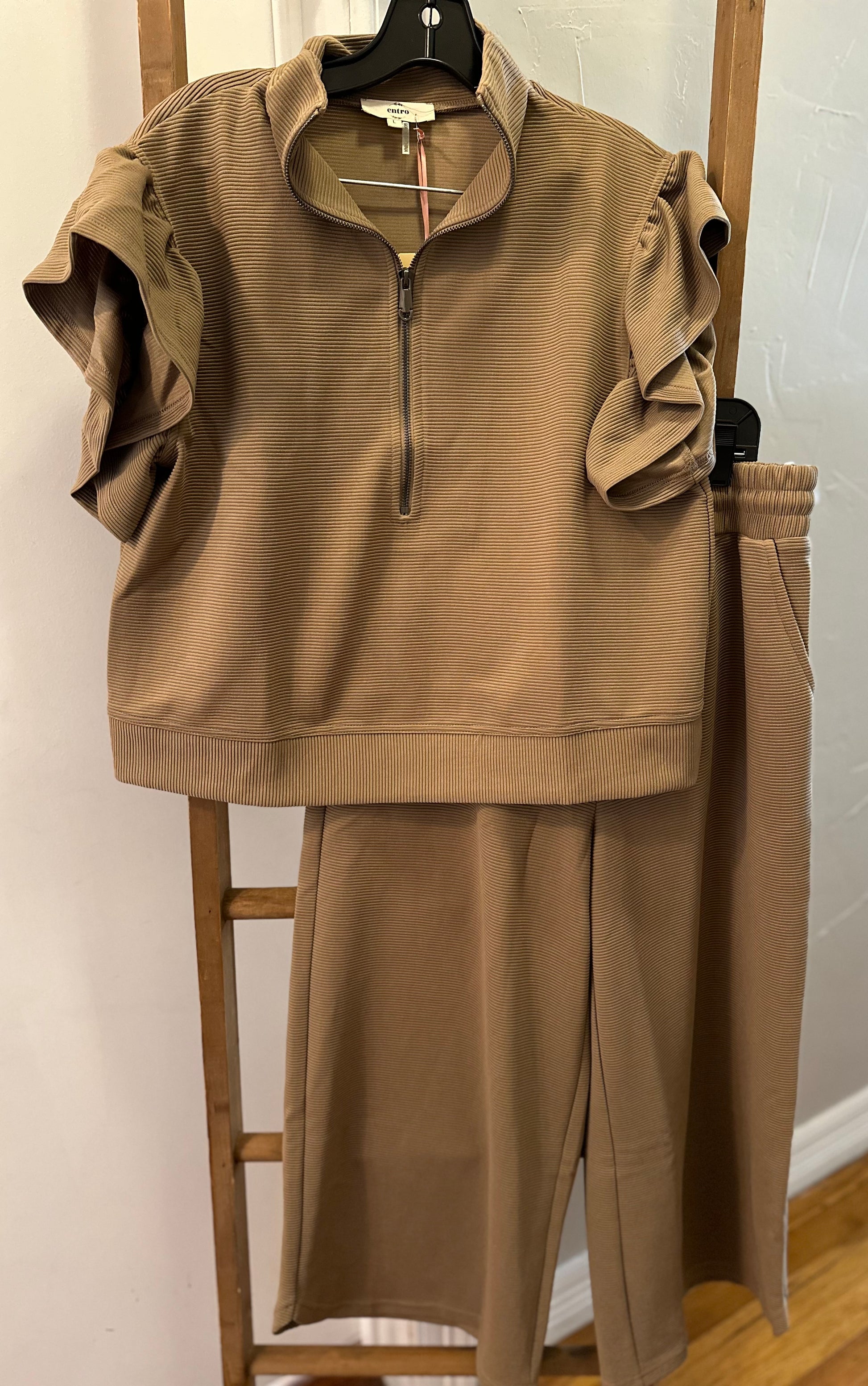 Top- Textured solid ruffle sleeve top featuring zipper closure at front. Unlined. Knit. Non-sheer. Medium weight.