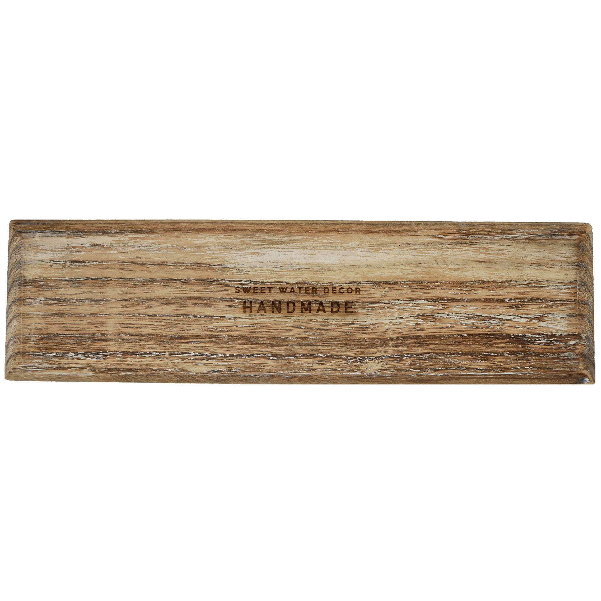 DETAILS: • Size: 14" x 4" x 1" • Material: Paulownia Wood • Color: Rustic Wood Tray with White Distressed Details • Waterproof: A Coating was Added, But Do Not Let Water Sit In Tray
