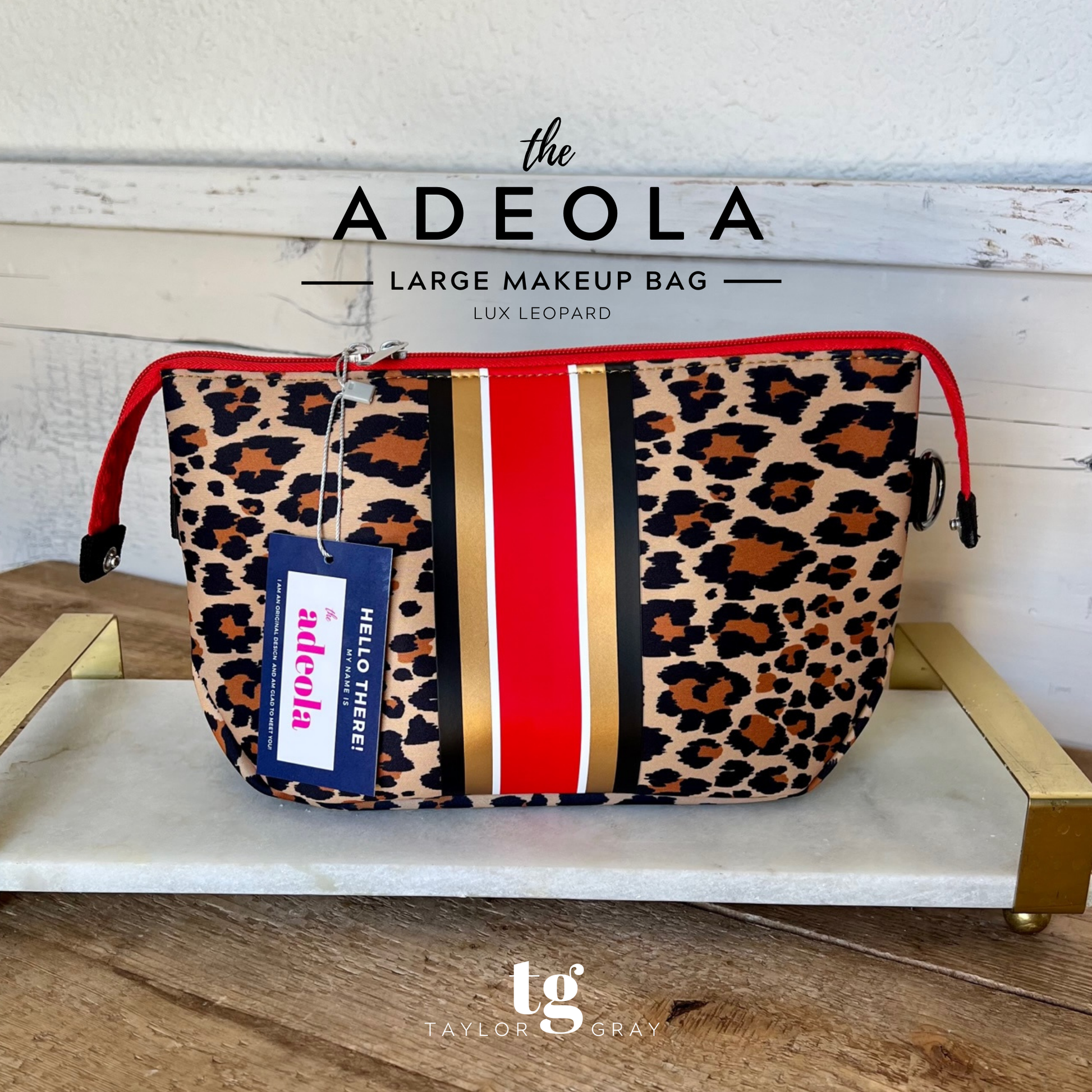 Makeup Bag: Brown and Black Leopard Striping: Black, Metallic Gold, White and Ruby Red Inside Bag: Black with mesh pocket Back of Bag: TAYLOR GRAY rubber logo Side of Bag: D rings so you can add your own strap to make it into a belt bag or crossbody (DOES NOT INCLUDE STRAP) DIMENSIONS: 12" long x 7" tall x 4" wide