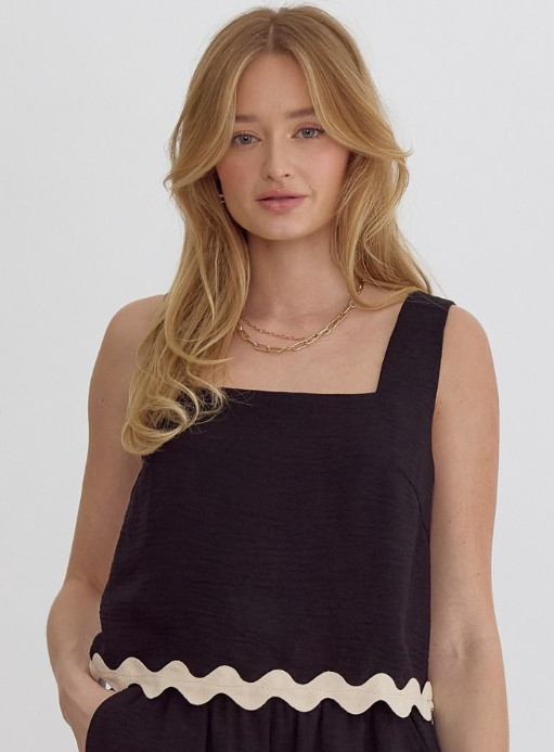 Top: Solid square neck cropped top featuring ric rac trim. Lined. Woven. Non-sheer. Lightweight.